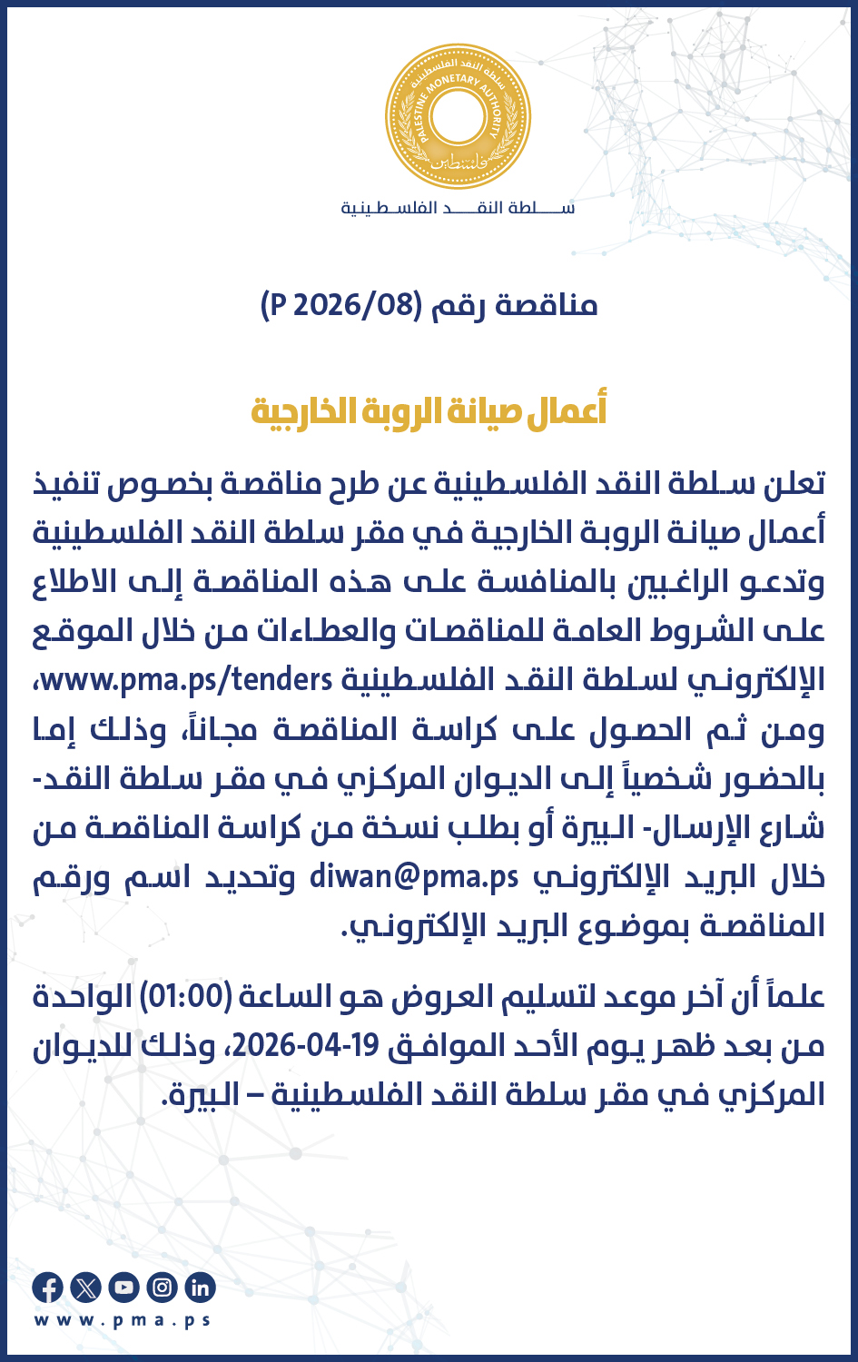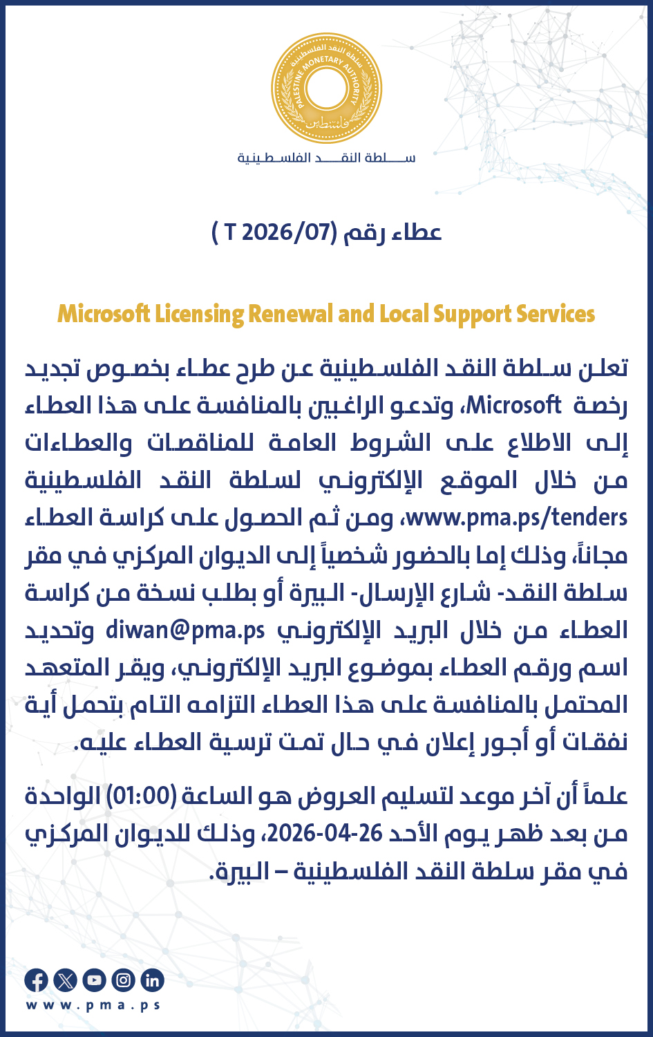 "إن الشروط العامة للمناقصات والعطاءات شمولية وتخص كافة العطاءات والمناقصات بغض النظر عن طبيعتها وبالتالي يلزم الاطلاع عليها لكافة مناقصات وعطاءات سلطة النقد والالتزام بما هو وارد فيها، أما الشروط الخاصة فيتم إدراجها ضمن كراسة العطاء نفسها، وتبقى دائماً المرجعية لكافة المشتريات نظام اللوازم والخدمات وإلاشغال المعتمد والذي يمكن الحصول عليه من خلال صفحة التشريعات/أنظمة