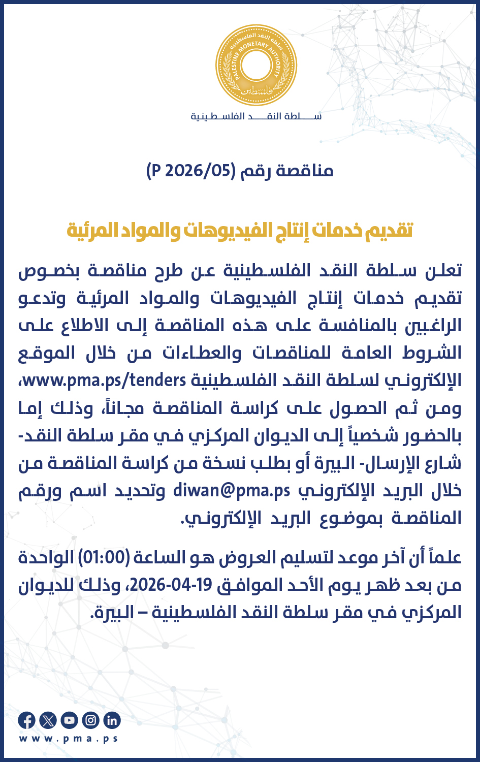 5. أن يكون لدى المورّد (الشركة) سجل ضريبي، مع الاستعداد لتقديم فواتير ضريبية وشهادة خصم المصدر وأية أوراق قد تكون لازمة لتسوية معاملاته المالية لدى سلطة النقد.